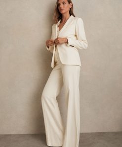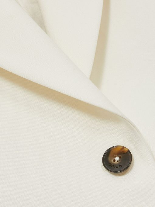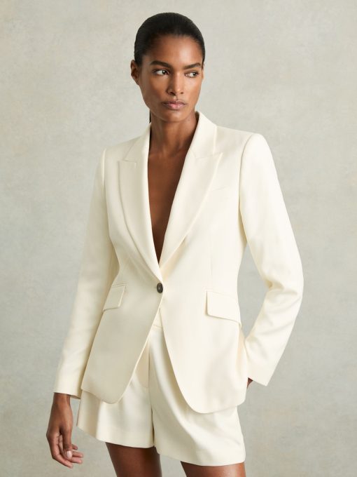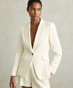 The cream Millie blazer combines a sleek, single-breasted silhouette with peak lapels and subtle shoulder padding for added structure. Its refined slanted flap pockets and a discreet front button complete the look, adding polish to this versatile, tailored staple. Single-breasted Peak lapels Lightly padded shoulders Buttoned cuffs Slanted welt pockets with flaps Single vent to reverse Lined Measurements of model: 5ft 10″ / 177.8cm. The model is wearing a size 8.
