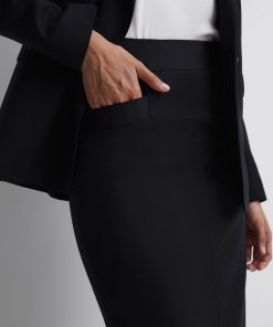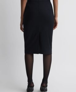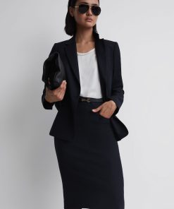 Upgrade your workwear options with the navy Haisley skirt, blended with premium wool yarns for a soft and comfortable wear. This style is crafted in a pencil shape, a flattering style for the silhouette. Tuck in one of our elegant cami tops underneath the coordinating blazer for a sleek office edit. High waist Zip closure Jetted pockets to each hip Single vent to reverse Tailored fit The model is wearing a size 8. Measurements of model: Height 5ft 9″ / 175cm. Petite waistband to hem 23″ / 59cm.