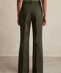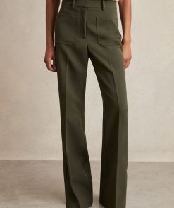 Crafted from smooth twill, the Green Priya trousers offer a modern take on tailored elegance. With a high-rise fit and flared legs, they feature patch pockets for added utility and a hook-and-bar fastening with a zip for a sleek finish. Twill Flared High rise Patch pockets Hook and bar fastening with zip Belt not included The model is wearing a size 8. Measurements of model: Height 5ft 9″ / 175cm. Petite inside leg length 30.5″ / 78cm.