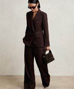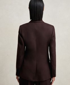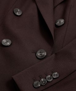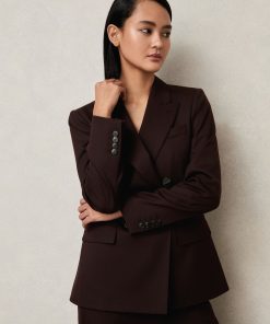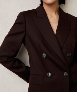 The Aubergine Solene blazer is cut from a wool-blend twill to a sharp double-breasted silhouette. Pick-stitched peak lapels, lightly shaped shoulders, and subtly branded buttons enhance its structured, polished feel. Wool-blend twill Double-breasted Pick-stitched peak lapels Shaped shoulders Single vent to reverse The model is wearing a size 8. Measurements of model: Height 5ft 9' / 175cm.