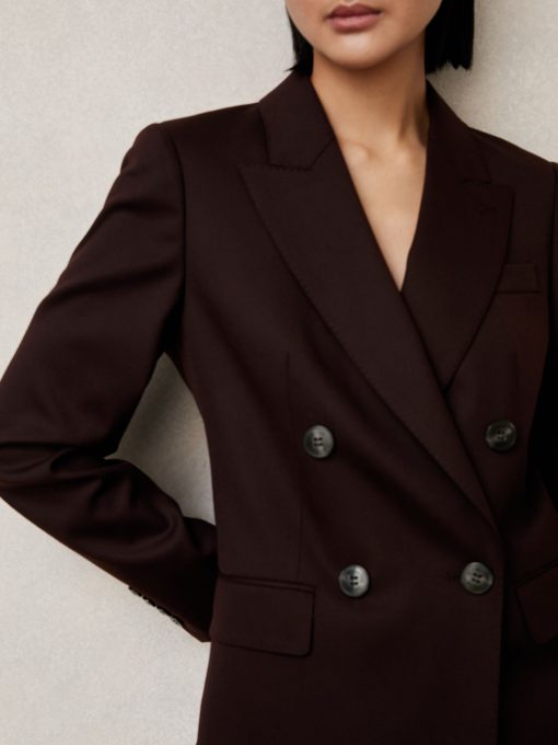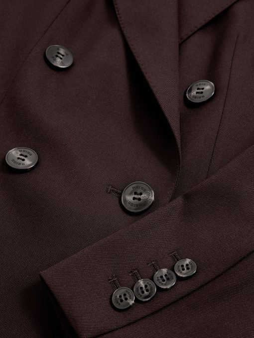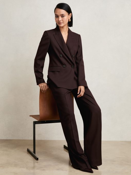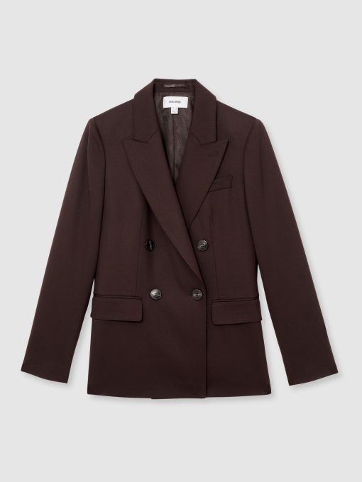The Aubergine Solene blazer is cut from a wool-blend twill to a sharp double-breasted silhouette. Pick-stitched peak lapels, lightly shaped shoulders, and subtly branded buttons enhance its structured, polished feel. Wool-blend twill Double-breasted Pick-stitched peak lapels Shaped shoulders Single vent to reverse The model is wearing a size 8. Measurements of model: Height 5ft 9' / 175cm.