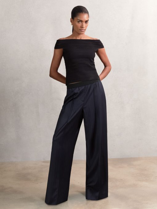 The Neave trousers are crafted from a fluid wool-blend twill that drapes to an effortless wide-leg silhouette. Subtly elevated by pinstripes, they have a comfortable elasticated waistband for both style and ease. Wool blend Pinstripes Wide leg Elasticated stripe waistband Front pintucks. The model is wearing a size 8. Measurements of model: Height 5'10' / 177.8cm. Petite inside leg length 28″ / 71cm.