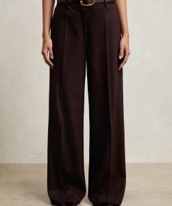 The Aubergine Solene trousers offer an effortlessly modern take on classic tailoring, cut from a wool-blend twill fabric to a fluid, wide-leg silhouette. Pressed creases and pick-stitched side pockets enhance their polished appeal. Wool-blend twill Wide leg pressed creases Double hook-and-bar with zip The model is wearing a size 8. Measurements of model: Height 5ft 9″ / 175cm.