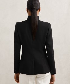 The Manon blazer is tailored from a premium wool-blend twill to a clean silhouette with sharp structure. Its wrapover front and standing collar offer a modern take on refined dressing.Wool-blend twillSingle-breastedWrapover frontStanding collarSingle vent to reverseFront buttons Petite centre back neck to hem 25″ / 63cm.
