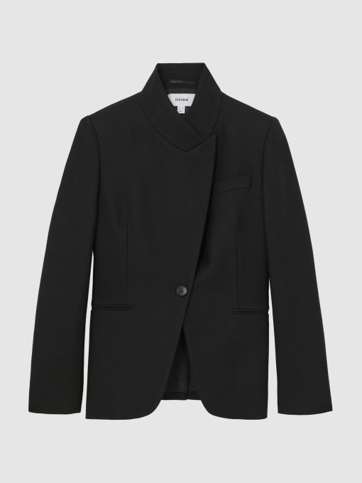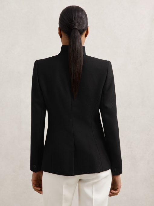 The Manon blazer is tailored from a premium wool-blend twill to a clean silhouette with sharp structure. Its wrapover front and standing collar offer a modern take on refined dressing.Wool-blend twillSingle-breastedWrapover frontStanding collarSingle vent to reverseFront buttons Petite centre back neck to hem 25″ / 63cm.
