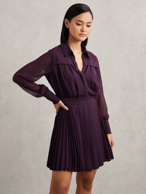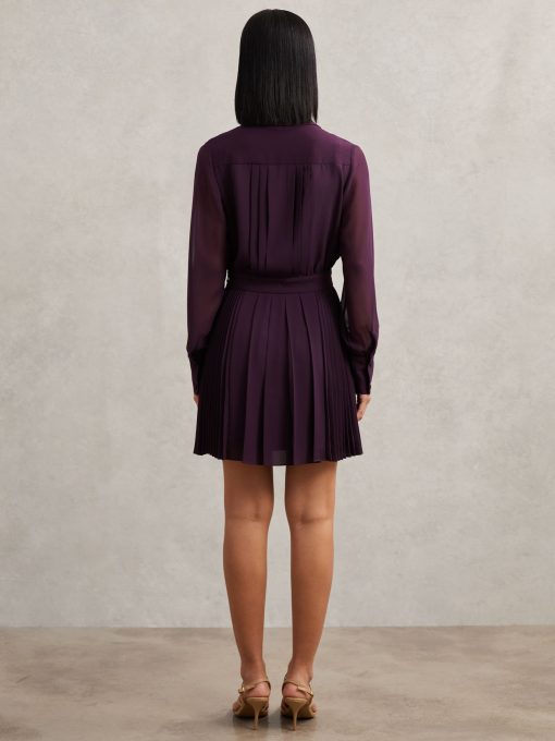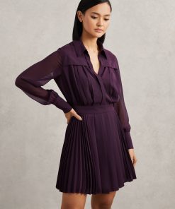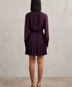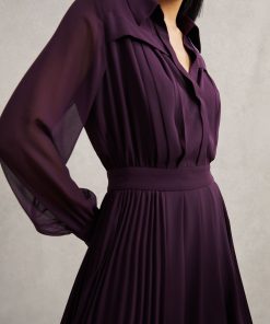 Crafted from airy georgette, the Giselle dress balances sharp pleating with sheer, button-cuff sleeves for refined depth and movement. A fitted waistband and open collar lend structure to its softly feminine silhouette.PleatingSheer sleeves with button cuffsFitted waistbandOpen collar with concealed buttonsSide buttons with concealed zip Regular side neck to hem 35″ / 89cm.