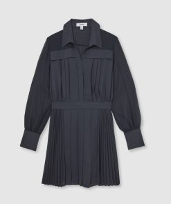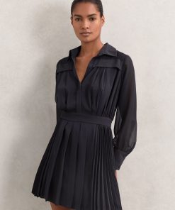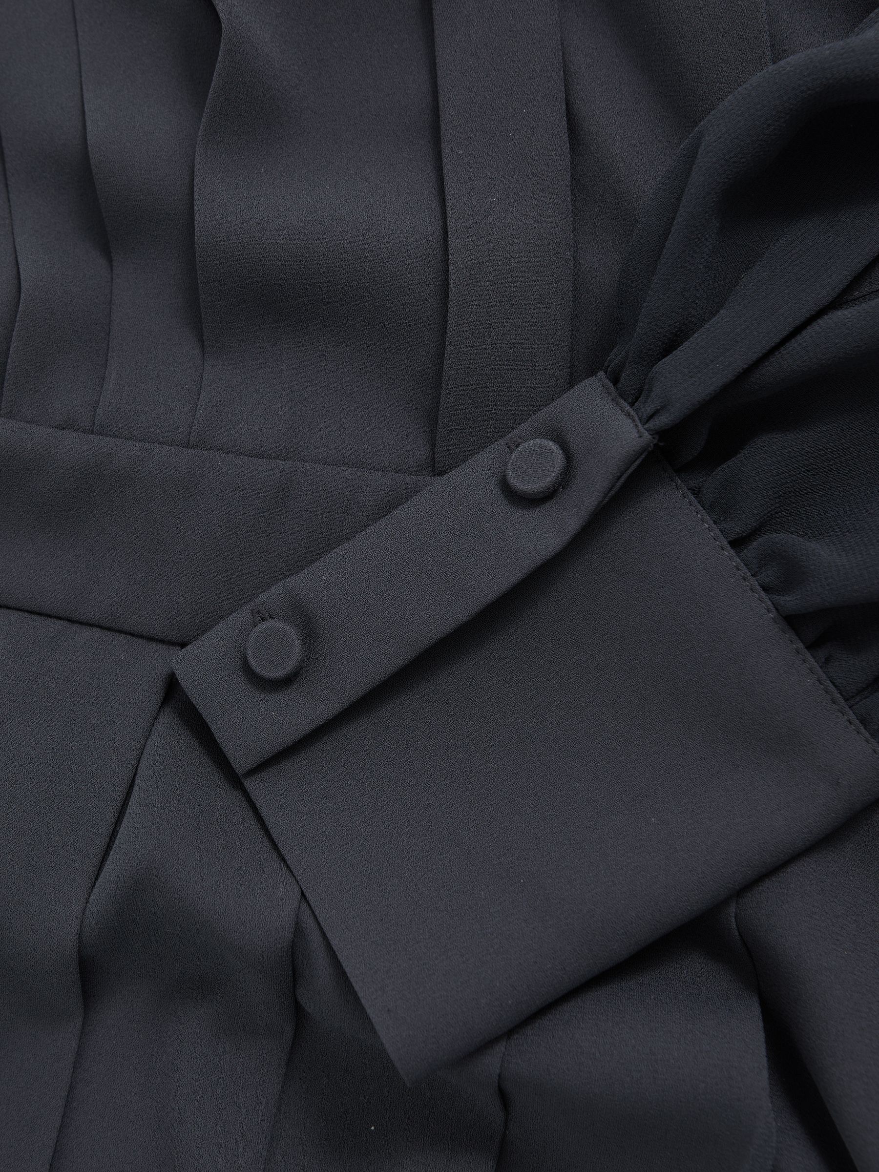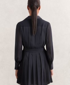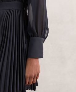 Crafted from airy georgette, the Giselle dress balances sharp pleating with sheer, button-cuff sleeves for refined depth and movement. A fitted waistband and open collar lend structure to its softly feminine silhouette.PleatingSheer sleeves with button cuffsFitted waistbandOpen collar with concealed buttonsSide buttons with concealed zip The model is wearing a size 8 Measurements of model: Height 5 10″ / 177.8cm Regular side neck to hem 35″ / 89cm.