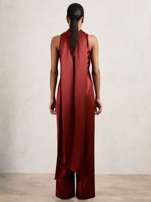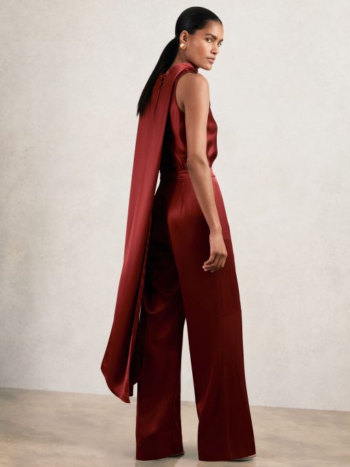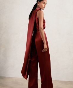 The Farah jumpsuit exudes occasion-ready elegance in dark red satin. Cape-style sashes drape gracefully down the back, while the fluid wide-leg design enhances the silhouette, with the fabric’s lustrous sheen adding a refined, effortless touch. Satin fabric Cape style Wide leg Sleeveless Concealed zip Regular inside leg length 31.5″ / 80cm.