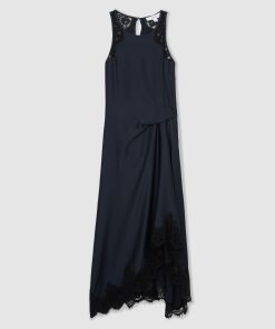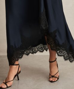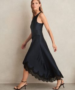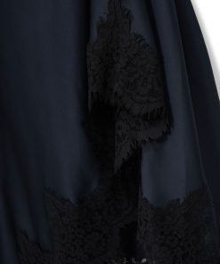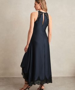 Inspired by our best-selling Micah style, the Navy Anais dress exudes effortless elegance with its satin finish and delicate lace trims at the armholes and hem. It’s fitted through the body, with a gentle tuck at the waist that releases into a softly draped, asymmetric midi skirt. Satin Lace trim Drape tuck detail Button keyhole with concealed zip to reverse Asymmetric midi length The model is wearing a size 8. Measurements of model: 5ft 9.5″ / 176.5cm. Regular side neck to hem 53″ / 135cm.