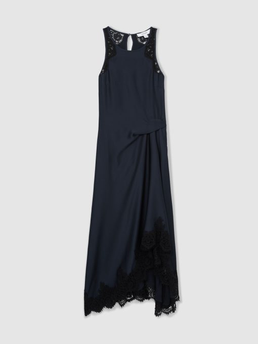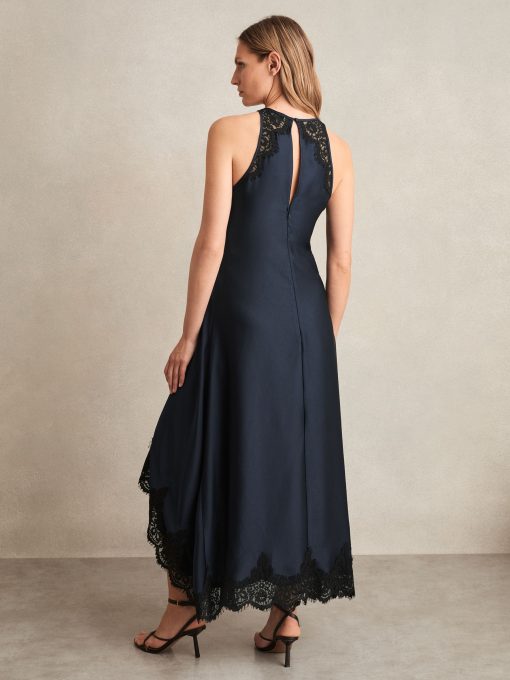 Inspired by our best-selling Micah style, the Navy Anais dress exudes effortless elegance with its satin finish and delicate lace trims at the armholes and hem. It’s fitted through the body, with a gentle tuck at the waist that releases into a softly draped, asymmetric midi skirt. Satin Lace trim Drape tuck detail Button keyhole with concealed zip to reverse Asymmetric midi length The model is wearing a size 8. Measurements of model: 5ft 9.5″ / 176.5cm. Regular side neck to hem 53″ / 135cm.