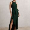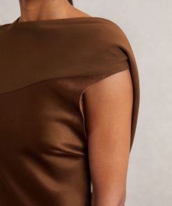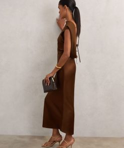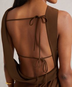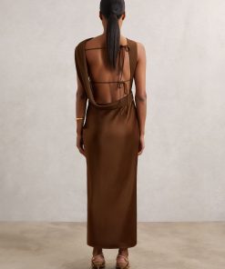 Crafted from fluid satin, the Bronze Alula dress is a standout evening style that falls to an effortless midi length. Its draped high neckline sweeps through to the back, where an open design is elegantly elevated by delicate self-tie straps. Satin fabrication Draping High asymmetric neckline Open back with ties Side slit Concealed side zip The model is wearing a size 8. Measurements of model: Height 5ft 10″ / 177.8cm. Regular side neck to hem 53″ / 134cm.