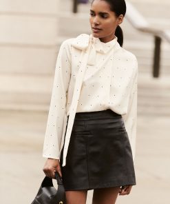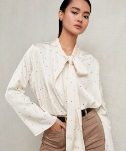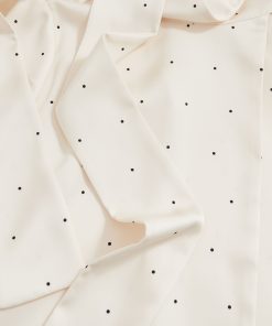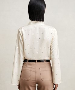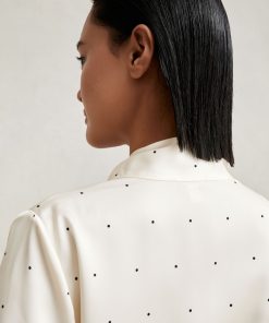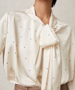 The Rina blouse is cut from fluid satin, subtly elevated with polka dots for a modern finish. Neck ties are designed to drape asymmetrically through a wrap-style front and thread-through collar, lending a refined, directional touch. Satin fabric Polka-dot print Wrap-style front with tie neckline Long sleeves The model is wearing a size 8. Measurements of model: Height 5ft 9″ / 175cm.
