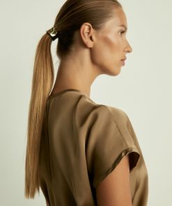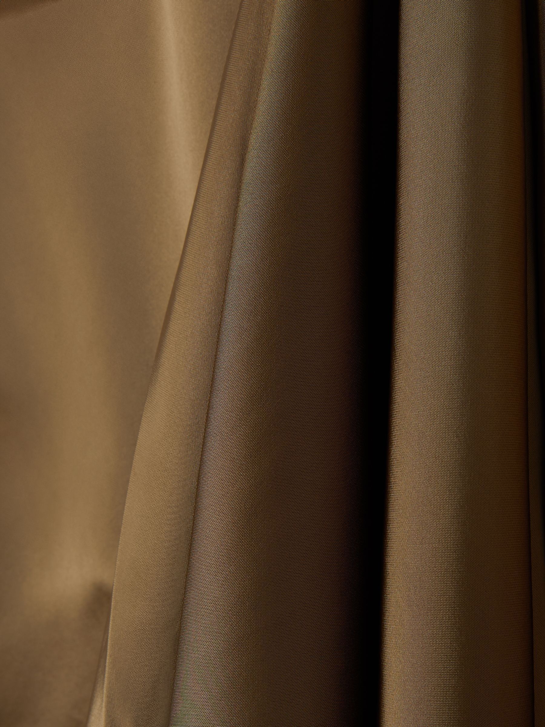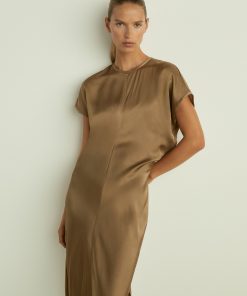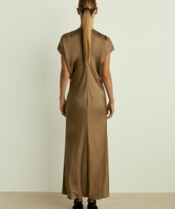 Cut from smooth satin, the khaki Kora midi dress presents a masterclass in understated elegance. Soft draping around the bust and back creates subtle intrigue. Lightweight satin Draping Round neck Leg slit Rear buttoned keyhole The model is wearing a size 8. Measurements of model: Height 5ft 9″ / 175cm. Regular side neck to hem 56″ / 142cm.