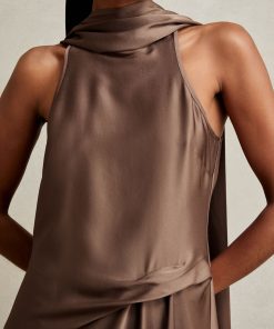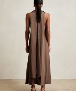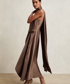 Inspired by our bestselling Fae and Micah styles, the Taupe Brown Michelle dress blends signature elements into one refined design. Crafted from fluid satin, it features a tucked waist that drapes through an asymmetric midi hem, while a soft cowl neckline flows into a cape-style back for an elegant finish. Satin Cape style Waist tuck detail Sleeveless Concealed zip to reverse The model is wearing a size 8. Measurements of model: Height 5ft 10″ / 177.8cm. Regular side neck to hem 52.5″ / 133cm.