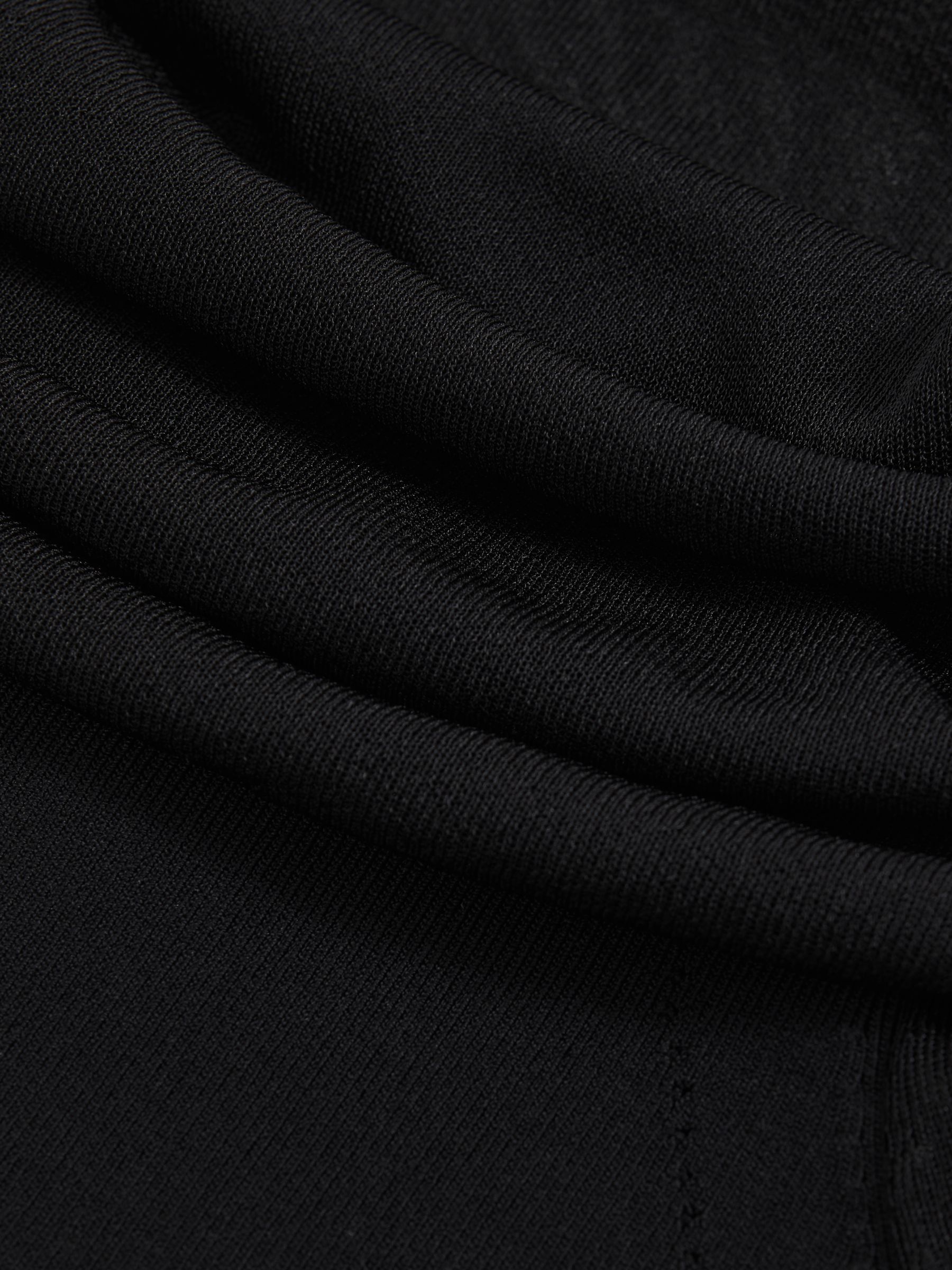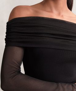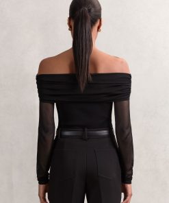 The Angie top pairs sheer mesh with a ruched Bardot neckline for an elevated approach to evening styling. A compact knit through the body adds soft structure, shaping a refined, form-fitting silhouette. Ruched Bardot neckline. Compact knit body. Sheer mesh sleeves. The model is wearing a size S. Measurements of model: Height 5ft 10″ / 177.8cm.