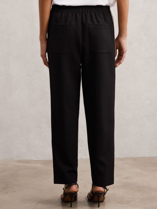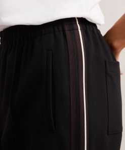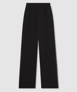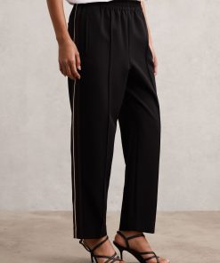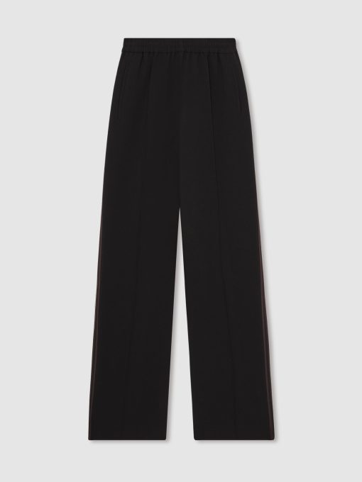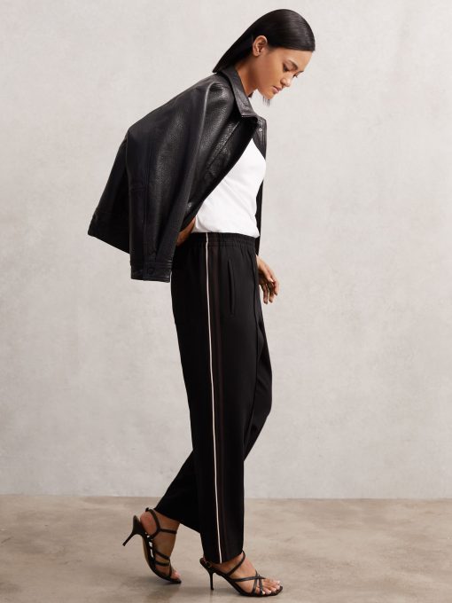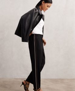 Crafted from jersey twill, the Robyn trousers blend relaxed tailoring with a sporty edge. The wide-leg silhouette is accented by dynamic side stripes, while an elasticated waistband ensures effortless comfort. Front pintucks add a touch of structure, balancing ease with refinement. Jersey twill Wide leg Side stripes Elasticated waistband Front pintucks The model is wearing a size 8. Measurements of model: Height 5ft 10″ / 178cm. Regular inside leg length 28″ / 71cm. Long inside leg length 28″ / 71cm.