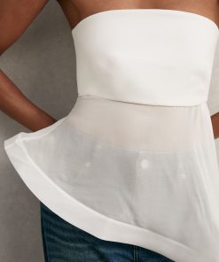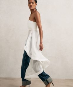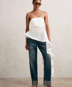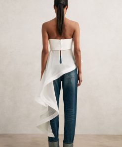 The Rhianna top is crafted from silk with a structured, fitted bodice and a bandeau neckline. It flows into a sheer, asymmetric ruffle that cascades down one side, framed with a defined trim to add drama and movement. 100% silk Structured asymmetric ruffle Bandeau neckline Zip to reverse The model is wearing a size 8. Measurements of model: Height 5ft 9″ / 175cm.