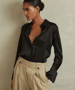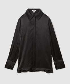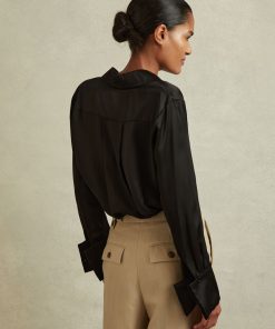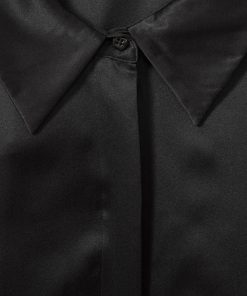Choose the black Hailey shirt, cut from smooth silk for a sensual feel and a luxurious look. It's punctuated by a concealed button closure and statement, oversized cuffs. 19mm silk satin fabrication Point collar Concealed button front closure Oversized cuffs Box pleat to reverse The model is wearing a size 8. Measurements of model: Height 5ft 10″ / 178cm.