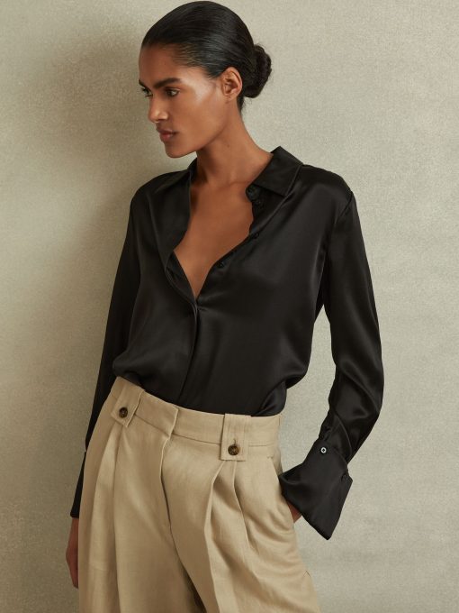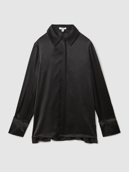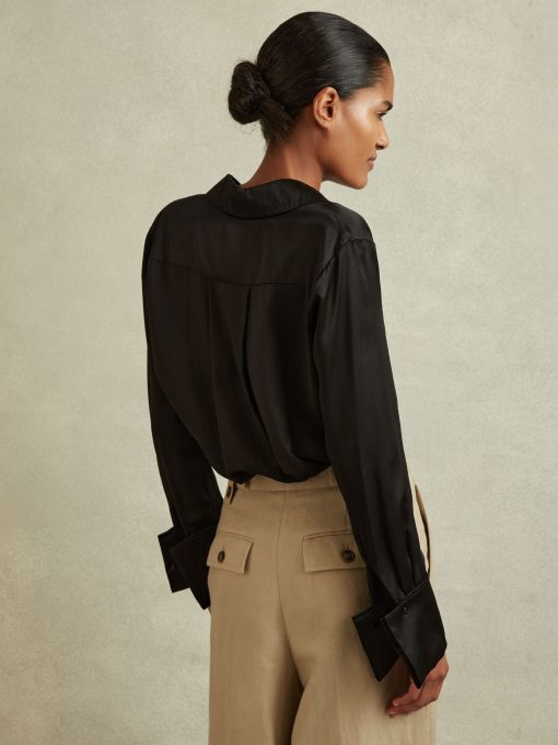 Choose the black Hailey shirt, cut from smooth silk for a sensual feel and a luxurious look. It's punctuated by a concealed button closure and statement, oversized cuffs. 19mm silk satin fabrication Point collar Concealed button front closure Oversized cuffs Box pleat to reverse The model is wearing a size 8. Measurements of model: Height 5ft 10″ / 178cm.