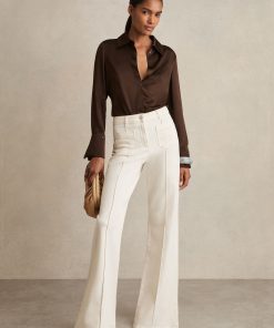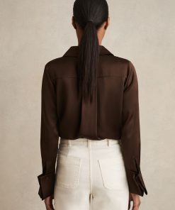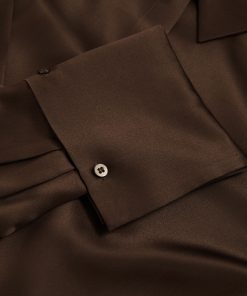 Crafted from pure silk, the chocolate Hailey shirt offers a luxurious drape and an elevated finish. A concealed button placket ensures a clean aesthetic, whilst oversized double cuffs and a pointed collar make a bold yet refined statement. 100% silk Buttoned double cuffs Pointed collar Single box pleat to reverse Concealed button placket The model is wearing a size 8. Measurements of model: Height 5ft 10' / 178cm.