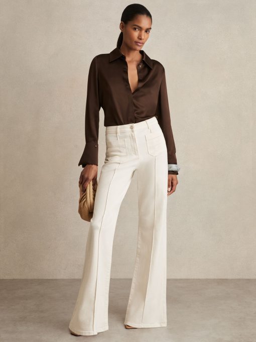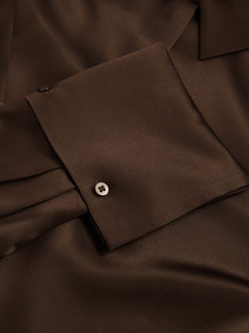 Crafted from pure silk, the chocolate Hailey shirt offers a luxurious drape and an elevated finish. A concealed button placket ensures a clean aesthetic, whilst oversized double cuffs and a pointed collar make a bold yet refined statement. 100% silk Buttoned double cuffs Pointed collar Single box pleat to reverse Concealed button placket The model is wearing a size 8. Measurements of model: Height 5ft 10' / 178cm.