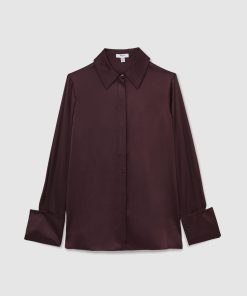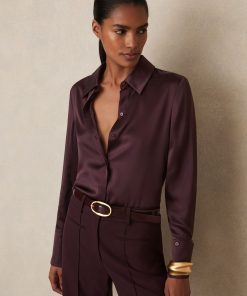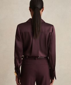 Crafted from pure silk, the red Hailey shirt offers a luxurious drape and an elevated finish. A concealed button placket ensures a clean aesthetic, whilst oversized double cuffs and a pointed collar make a bold yet refined statement. 100% silk Buttoned double cuffs Pointed collar Single box pleat to reverse Concealed button placket The model is wearing a size 8. Measurements of model: 5ft 9.5″ / 176cm.
