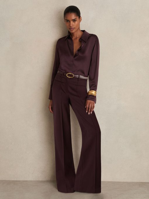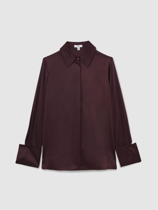 Crafted from pure silk, the red Hailey shirt offers a luxurious drape and an elevated finish. A concealed button placket ensures a clean aesthetic, whilst oversized double cuffs and a pointed collar make a bold yet refined statement. 100% silk Buttoned double cuffs Pointed collar Single box pleat to reverse Concealed button placket The model is wearing a size 8. Measurements of model: 5ft 9.5″ / 176cm.