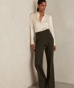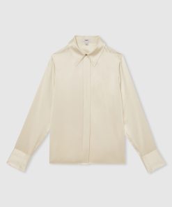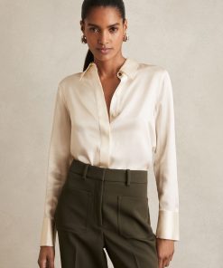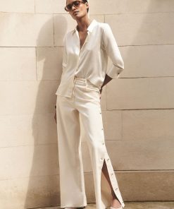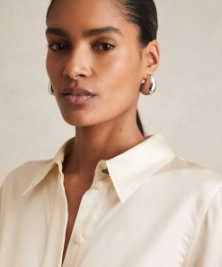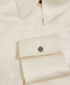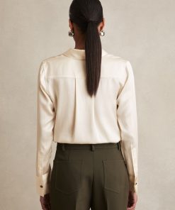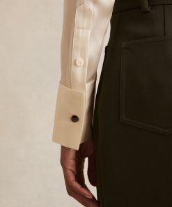 Crafted from 100% silk satin, the Ivory Ameira shirt drapes fluidly with a near-liquid lustre. Its concealed button placket maintains a sleek profile, while double-buttoned cuffs add a tailored finish. 100% silk satin Pointed collar Button double cuffs Central pleat to reverse Concealed front buttons The model is wearing a size 8. Measurements of model: Height 5ft 10″ / 177.8cm.