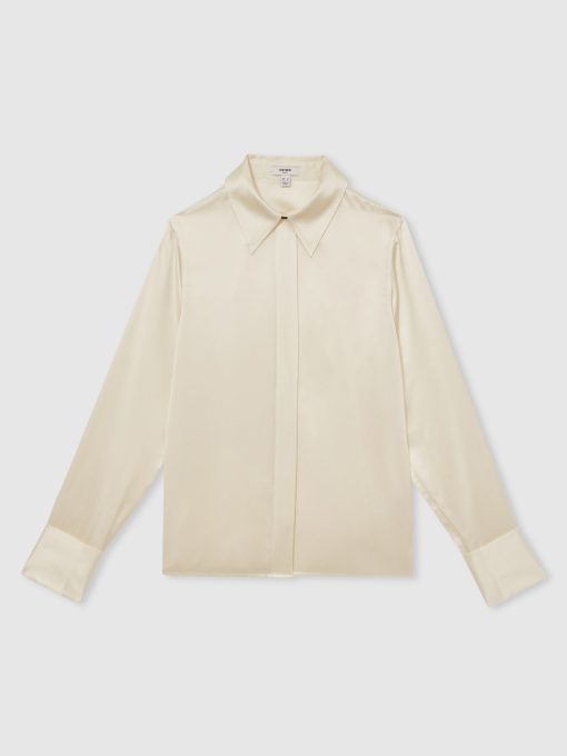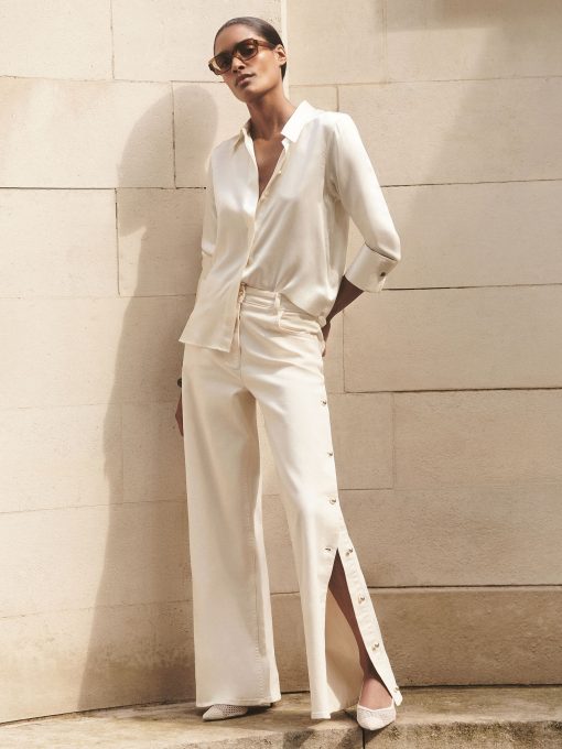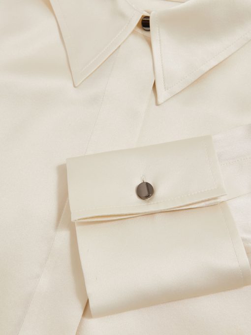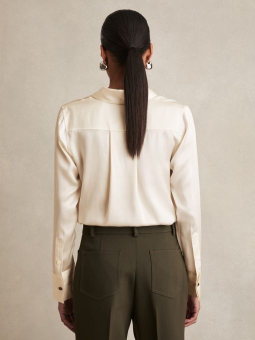 Crafted from 100% silk satin, the Ivory Ameira shirt drapes fluidly with a near-liquid lustre. Its concealed button placket maintains a sleek profile, while double-buttoned cuffs add a tailored finish. 100% silk satin Pointed collar Button double cuffs Central pleat to reverse Concealed front buttons The model is wearing a size 8. Measurements of model: Height 5ft 10″ / 177.8cm.