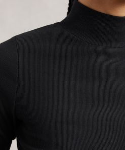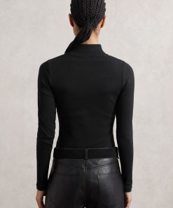 Simple and sophisticated, the Black Polly top has a high funnel neck and a body-skimming fit, enhanced by a touch of stretch in its cotton fabric. A fine rib adds subtle texture, while long sleeves make it perfect for cool-weather layering. Cotton with stretch Fine ribbing Funnel neck Long sleeves