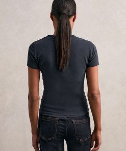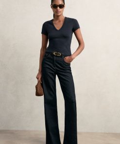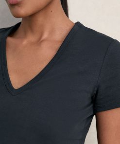 The Navy Leia T-Shirt is crafted from stretch-cotton jersey for a soft, comfortable feel. A V-neckline and short sleeves lend it timeless appeal, ideal for effortless layering. Cotton jersey with stretch V-neckline Short sleeves The model is wearing a size S. Measurements of model: Height 5ft 10″ / 177.8cm.
