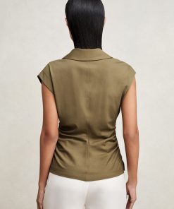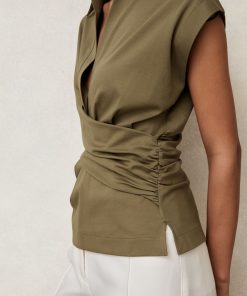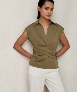 A wrap design that drapes effortlessly across the front lends the Jean top a sense of modern elegance. It’s crafted from stretch-cotton jersey and framed with a spread collar and V-Neckline for soft structure around the topline. Stretch-cotton jersey. Wrap front. Collar with V-Neckline. Gathered sides. Cap sleeves.
