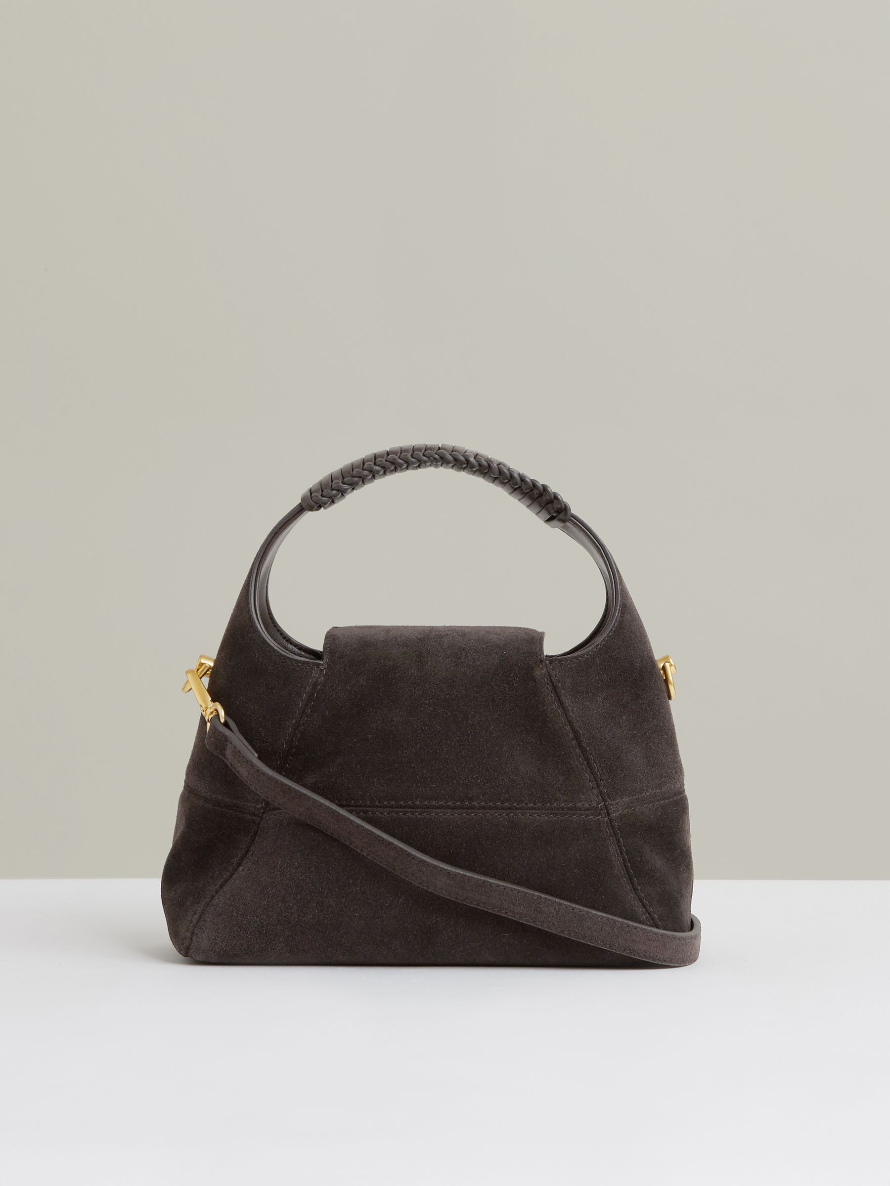 The Octavia bag is crafted from supple suede with smooth leather accents for an elegant contrast. A leather-wrapped shoulder strap adds artisanal detail, while a removable crossbody option offers styling versatility. Suede and leather. Leather wrapped shoulder strap. Internal slip pocket. Removable, adjustable cross-body strap. Top flap with magnetic closure. Height 15cm Width 22cm Depth 10cm