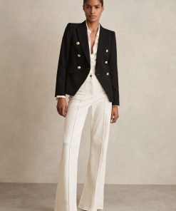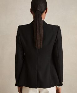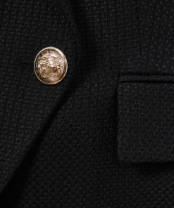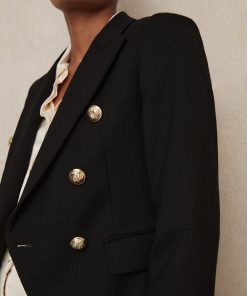 The black Tally double-breasted blazer has a tailored fit that sculpts the waist and defines the shoulders. It's wool blend fabric has a textured hand-feel which adds interest to both casual and smart edits. Wool blend Textured Double-breasted Gold-tone buttons Vent to reverse Lined Tailored fit The model is wearing a size 8. Measurements of model: Height 5ft 10″ / 177.8cm. Regular centre back neck to hem 26″ / 66cm.