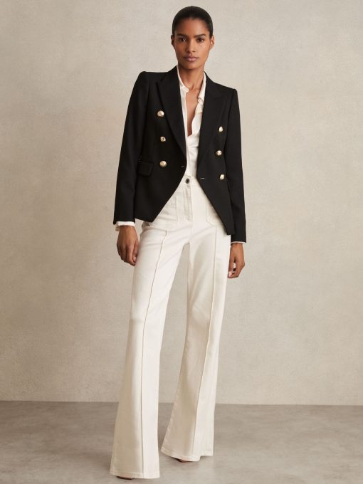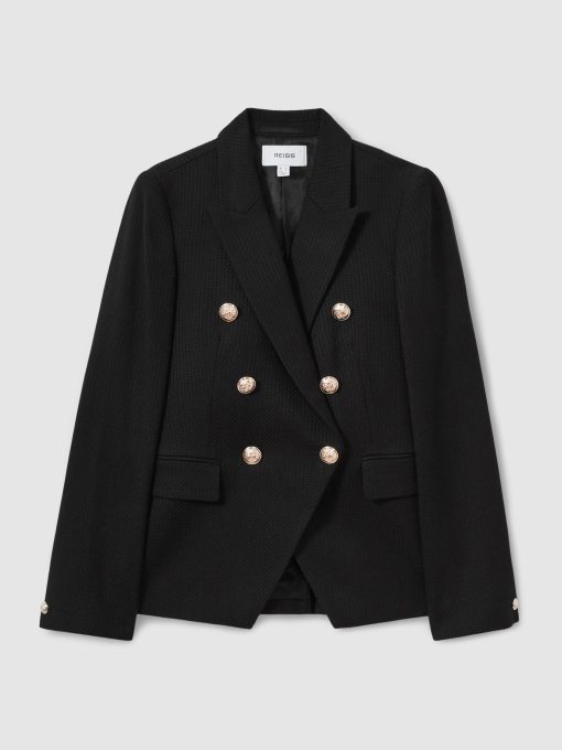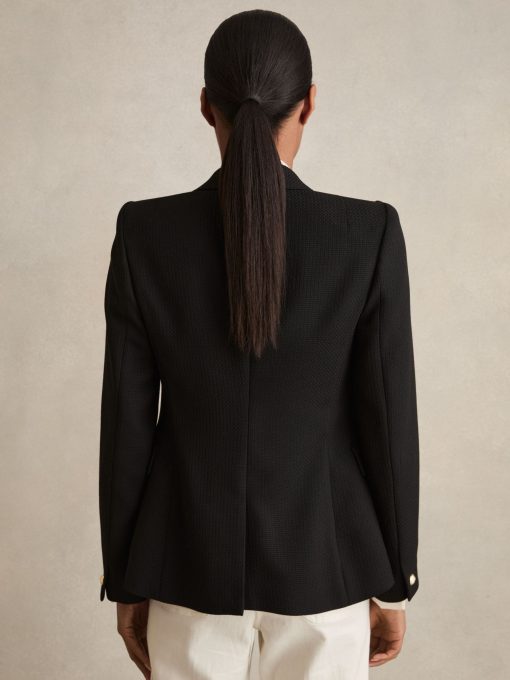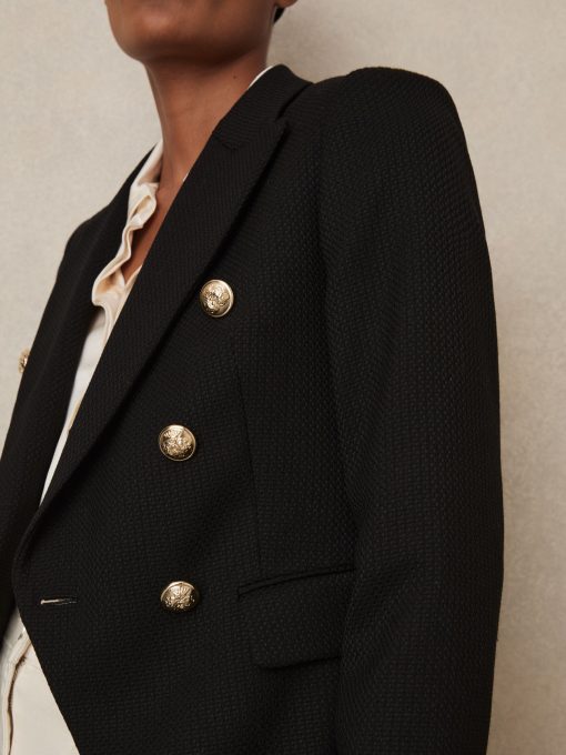 The black Tally double-breasted blazer has a tailored fit that sculpts the waist and defines the shoulders. It's wool blend fabric has a textured hand-feel which adds interest to both casual and smart edits. Wool blend Textured Double-breasted Gold-tone buttons Vent to reverse Lined Tailored fit The model is wearing a size 8. Measurements of model: Height 5ft 10″ / 177.8cm. Regular centre back neck to hem 26″ / 66cm.
