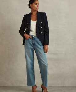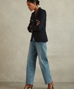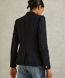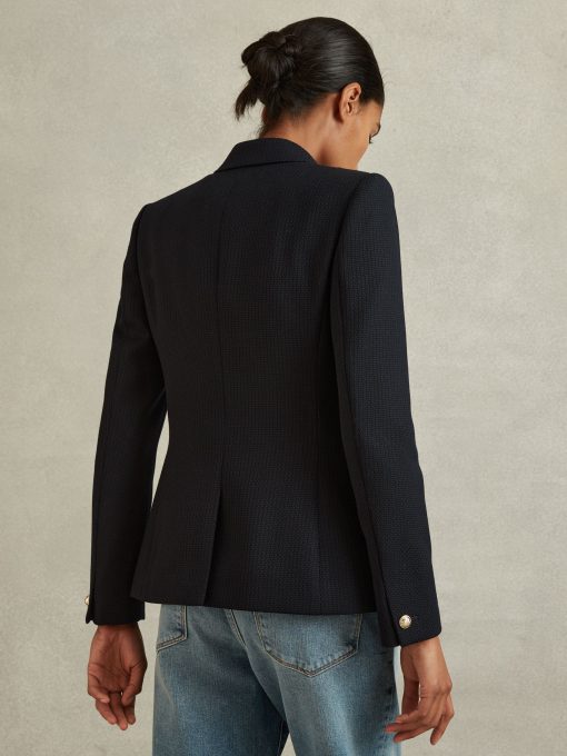 The Navy Tally double-breasted blazer has a tailored fit that sculpts the waist and defines the shoulders. It's wool blend fabric has a textured hand-feel which adds interest to both casual and smart edits. Wool blend Textured Double-breasted Gold-tone buttons Vent to reverse Lined Tailored fit The model is wearing a size 8. Measurements of model: Height 5 10″ / 177.8cm. Regular centre back neck to hem 26″ / 66cm.