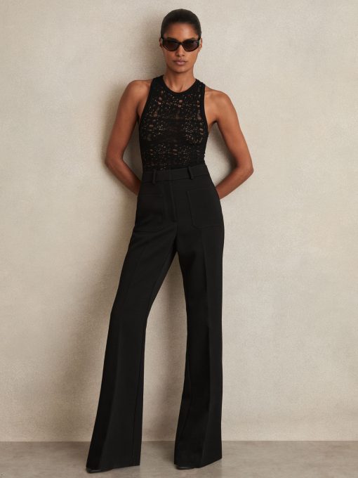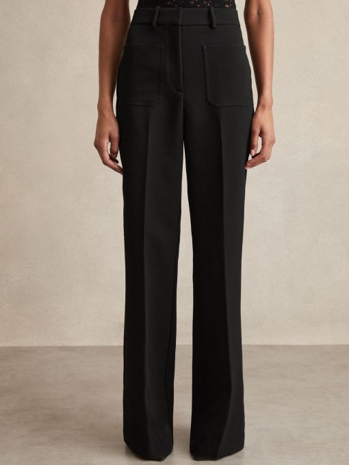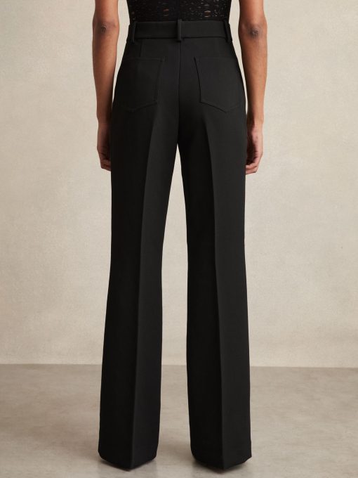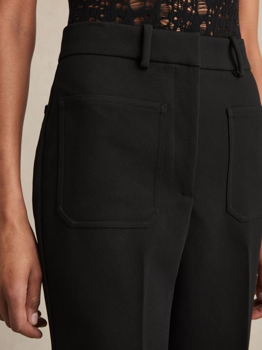 Crafted from smooth twill, the Black Priya trousers offer a modern take on tailored elegance. With a high-rise fit and flared legs, they feature patch pockets for added utility and a hook-and-bar fastening with a zip for a sleek finish. Twill Flared High rise Patch pockets Hook and bar fastening with zip Belt not included The model is wearing a size 8. Measurements of model: Height 5ft 10″ / 177.8cm. Regular inside leg length 34.5″ / 88cm.