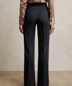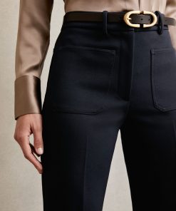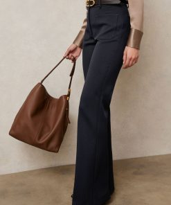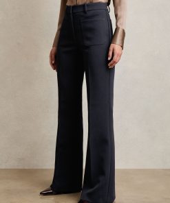 Crafted from smooth twill, the Priya Navy trousers offer a modern take on tailored elegance. With a high-rise fit and flared legs, they feature patch pockets for added utility and a hook-and-bar fastening with a zip for a sleek finish. Twill Flared High rise Patch pockets Hook and bar fastening with zip Belt not included The model is wearing a size 8. Measurements of model: 5ft 9.5″ / 177cm. Regular inside leg length 34.5″ / 88cm.