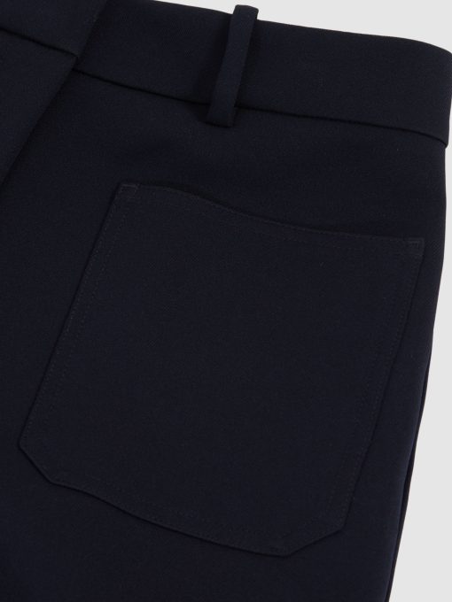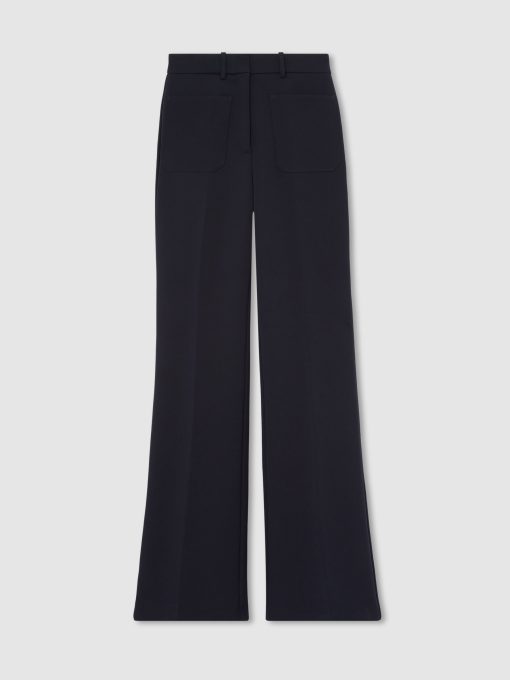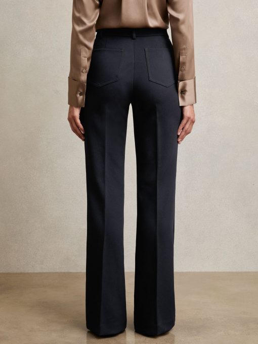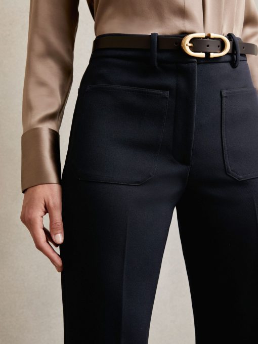 Crafted from smooth twill, the Priya Navy trousers offer a modern take on tailored elegance. With a high-rise fit and flared legs, they feature patch pockets for added utility and a hook-and-bar fastening with a zip for a sleek finish. Twill Flared High rise Patch pockets Hook and bar fastening with zip Belt not included The model is wearing a size 8. Measurements of model: 5ft 9.5″ / 177cm. Regular inside leg length 34.5″ / 88cm.