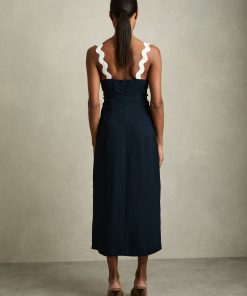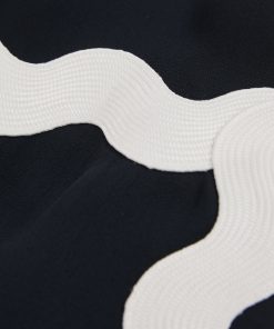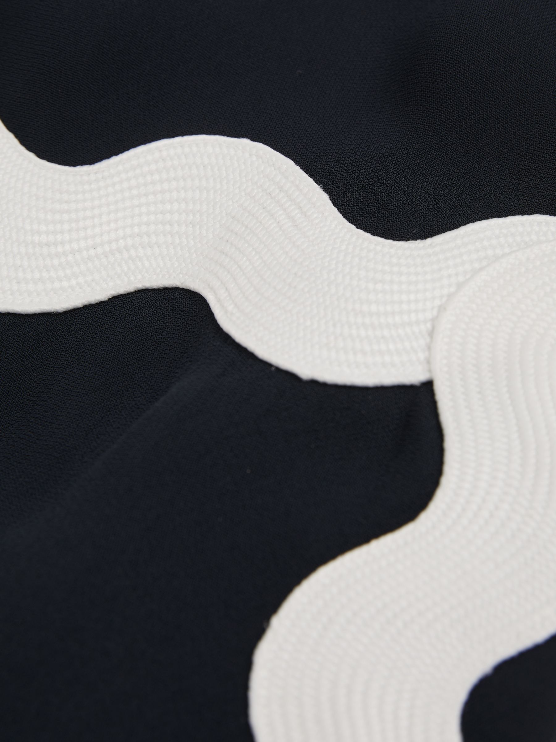 A contrasting wave trim defines the Asher midi dress, artfully contouring the sides, waistline, and shoulders. Midweight crepe provides a polished finish, while a full lining ensures a smooth, elegant drape. A single side slit enhances fluidity and movement. Mid-lightweight crepe Contrasting wave trim Wave shoulder straps Square neckline Side slit Lined Concealed zip to reverse The model is wearing a size 8. Measurements of model: Height 5ft 10″ / 177.8cm. Regular side neck to hem 44″ / 112cm.