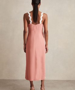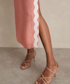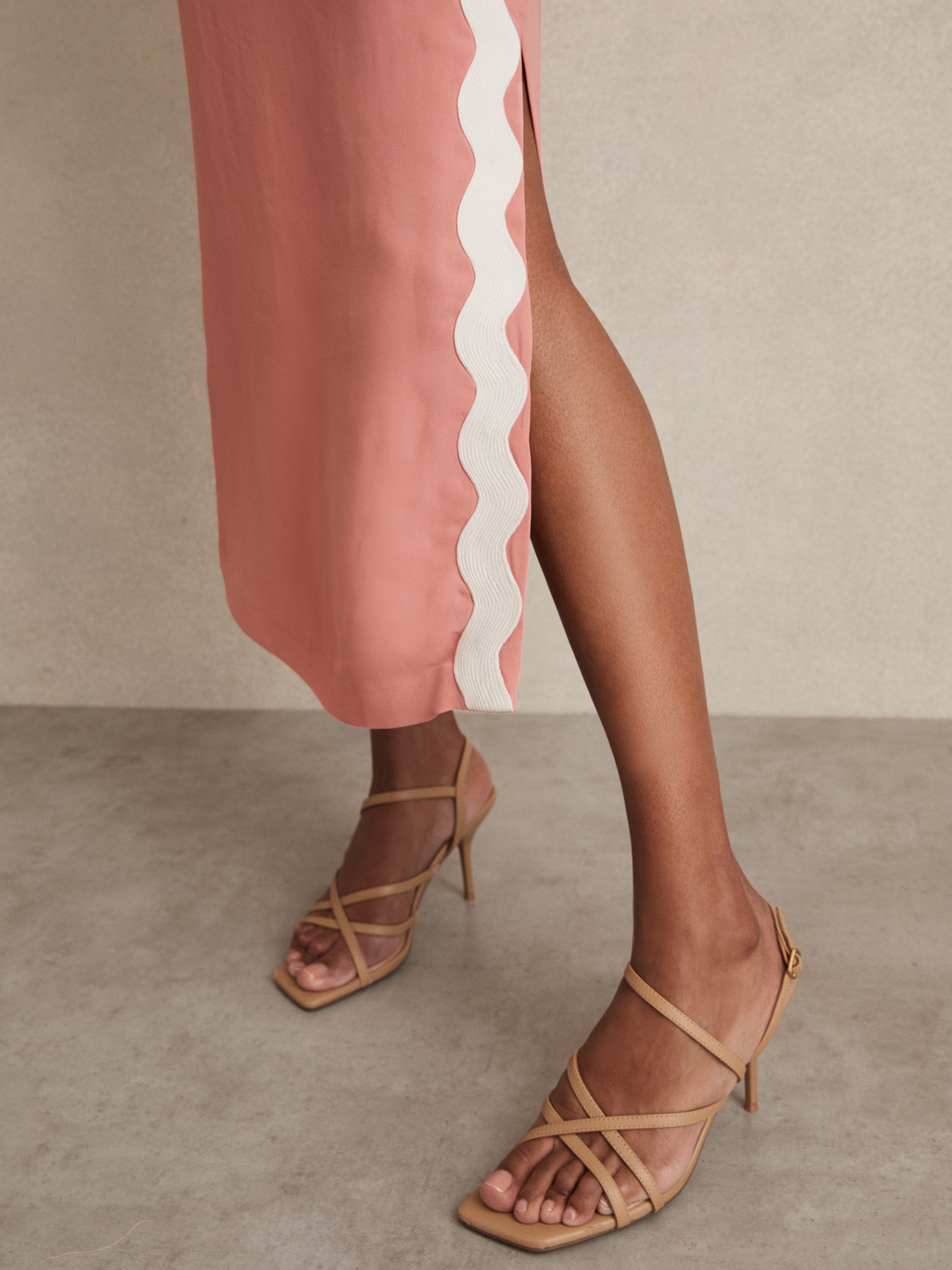 A contrasting wave trim defines the Asher midi dress, artfully contouring the sides, waistline, and shoulders. Midweight crepe provides a polished finish, while a full lining ensures a smooth, elegant drape. A single side slit enhances fluidity and movement. Mid-lightweight crepe Contrasting wave trim Wave shoulder straps Square neckline Side slit Lined Concealed zip to reverse The model is wearing a size 8. Measurements of model: Height 5ft 10″ / 177.8cm. Regular side neck to hem 44″ / 112cm.