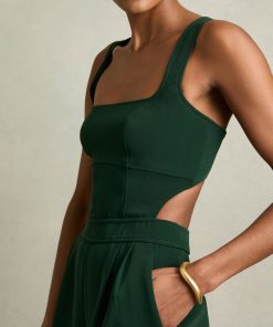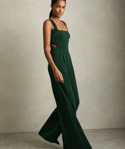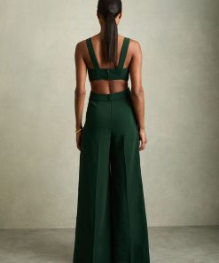 An exaggerated wide-leg silhouette, complemented by delicate pleating, adds elegant flow and movement to the Dion jumpsuit. A twill weave provides structure around the fitted torso, accentuating the figure and highlighting bold cut-outs. Twill weave Wide leg Cut-out back Square neckline Front pleats Side slip pockets Zip fastenings to reverse The model is wearing a size 8. Measurements of model: Height 5ft 10″ / 177.8cm. Regular inside leg length 30.5″ / 78cm.