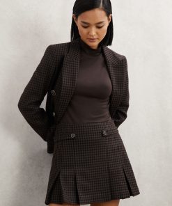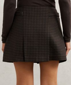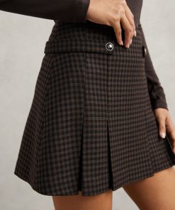 Crafted from a wool-blend in classic houndstooth check, the Elle mini skirt exudes polished, preppy style. Refined pleats and buttoned waist straps add subtle detail to the silhouette.Wool-blendHoundstooth checkButtoned waist strapsPleatingConcealed side zip Regular waistband to hem 15″ / 38cm.
