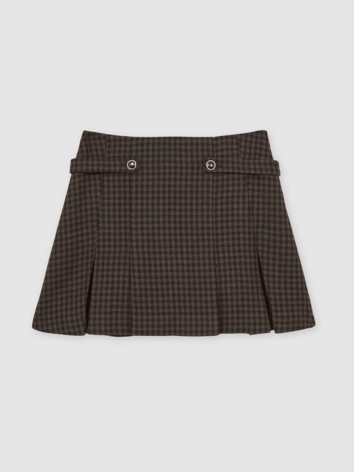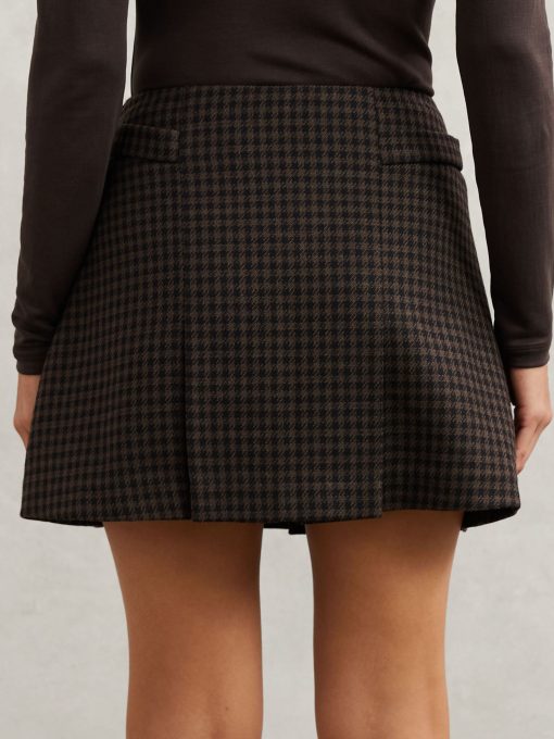 Crafted from a wool-blend in classic houndstooth check, the Elle mini skirt exudes polished, preppy style. Refined pleats and buttoned waist straps add subtle detail to the silhouette.Wool-blendHoundstooth checkButtoned waist strapsPleatingConcealed side zip Regular waistband to hem 15″ / 38cm.