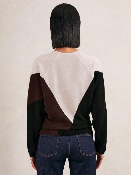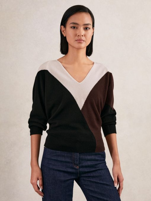 The June jumper makes a statement with its bold geometric design, knitted in contrasting panels for a color-blocked effect. Crafted from a soft wool blend with a touch of cashmere, it’s shaped with a relaxed V-neckline and slouchy raglan sleeves for an effortless feel. Wool blend with cashmere Colour-blocked design V-Neckline Raglan sleeves Ribbed hem and cuffs The model is wearing a size S. Measurements of model: Height 5ft 9' / 175cm.
