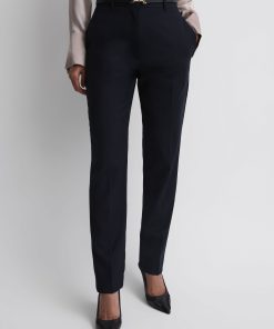 The Navy Haisley is a comfortable wool-rich option. They are engineered with a slim leg that tapers at the ankle. Tuck in a white blouse underneath the coordinating blazer for a monochrome office edit. Wool blend Mid-rise Side-slip pockets Pressed creases Slim leg Tapered fit The model is wearing a size 8. Measurements of model: 5ft 9″ / 175cm.