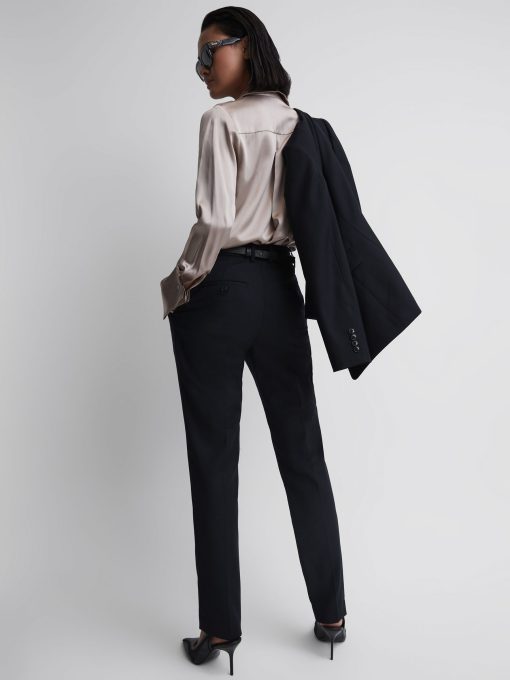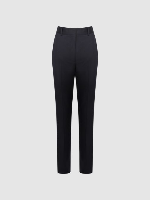 The Navy Haisley is a comfortable wool-rich option. They are engineered with a slim leg that tapers at the ankle. Tuck in a white blouse underneath the coordinating blazer for a monochrome office edit. Wool blend Mid-rise Side-slip pockets Pressed creases Slim leg Tapered fit The model is wearing a size 8. Measurements of model: 5ft 9″ / 175cm.
