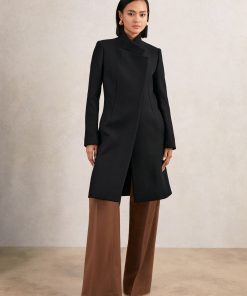 The Max coat is tailored from a premium wool blend to a clean, figure-skimming silhouette with sharp structure. Its wrapover front and standing collar offer a modern, refined take on cold-weather dressing. Wool blend Wrapover front Standing collar Single vent to reverse Concealed buttons The model is wearing a size 8 Measurements of model: Height 5ft 9' / 175cm Regular centre back neck to hem 39.5″ / 100cm.