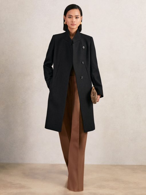 The Max coat is tailored from a premium wool blend to a clean, figure-skimming silhouette with sharp structure. Its wrapover front and standing collar offer a modern, refined take on cold-weather dressing. Wool blend Wrapover front Standing collar Single vent to reverse Concealed buttons The model is wearing a size 8 Measurements of model: Height 5ft 9' / 175cm Regular centre back neck to hem 39.5″ / 100cm.
