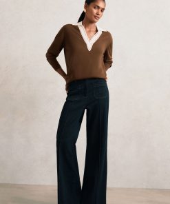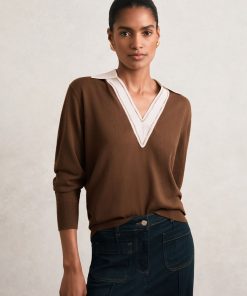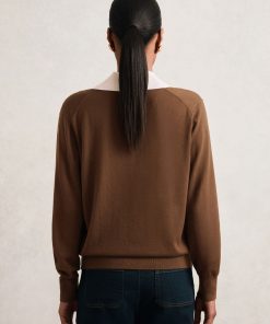 Inspired by classic cricket styles, the Nina jumper is crafted from fine wool with an exquisitely soft hand-feel. A contrasting flat open collar is complemented by a subtly embroidered V neckline. 100% wool Open collar V-neckline with embroidery Ribbed hem and cuffs The model is wearing a size S. Measurements of model: Height 5ft 10″ / 177.8cm.